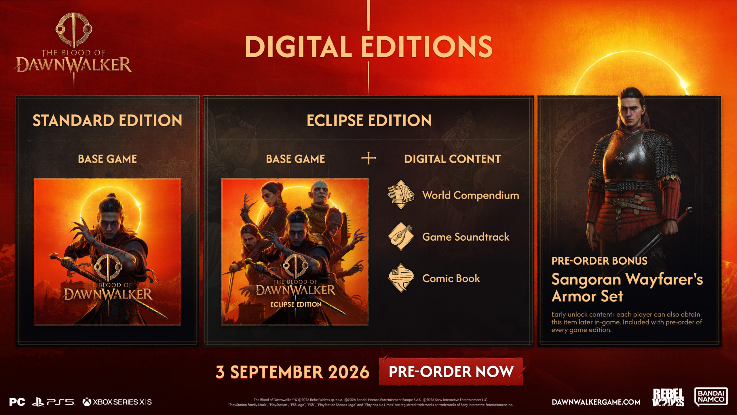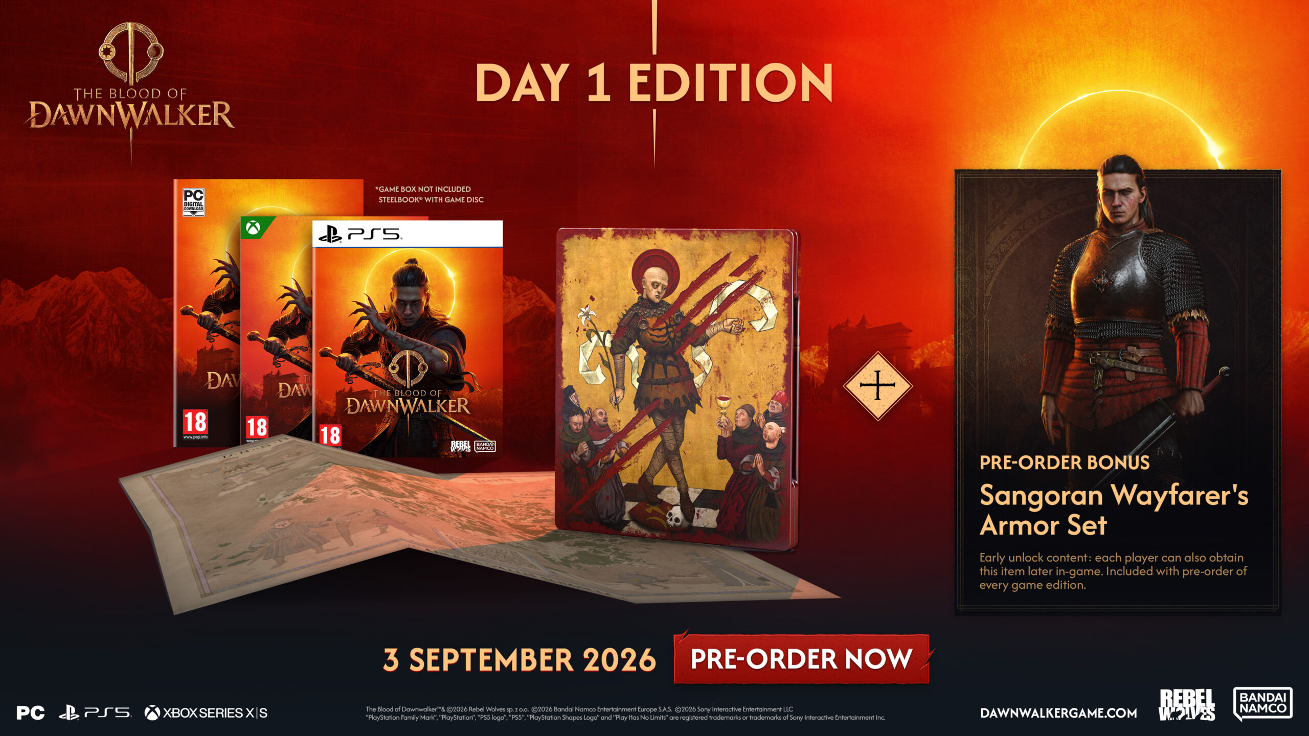 لعبة The Blood of Dawnwalker، أول لعبة من تطوير Rebel Wolves، تُطوَّر باستخدام Unreal Engine 5 وتنشرها Bandai Namco Entertainment. وستصدر في 3 سبتمبر على الحاسب الشخصي وPlayStation 5 وXbox Series X|S. الطلبات المسبقة متاحة الآن على جميع المنصات، ويمكن للاعبين إضافتها إلى قائمة الأمنيات. المزيد من التفاصيل عبر الموقع الرسمي: dawnwalkergame.com