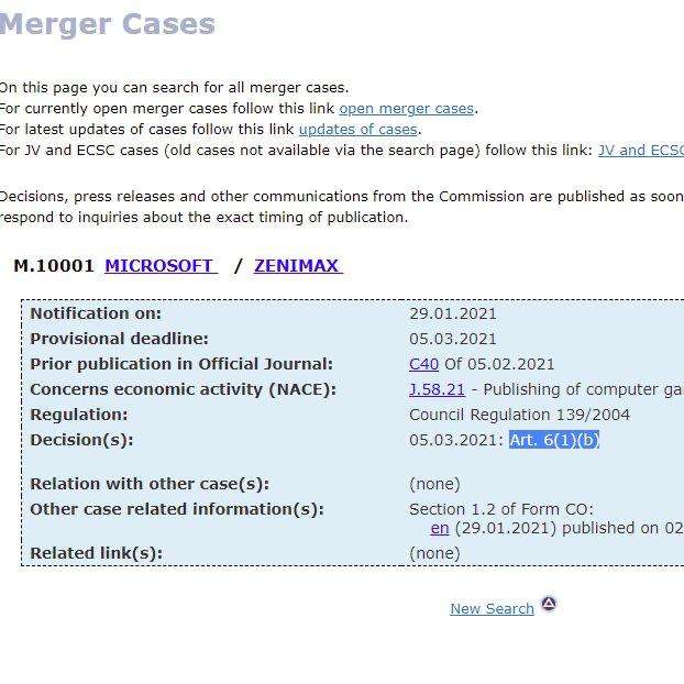 إتخذ الإتحاد الأوروبي قراره بشأن صفقة إستحواذ شركة Microsoft على شركة ZeniMax في وقت سابق من الإسبوع الماضي. و بحسب موقع المفوضية الأوروبية إنه بيوم 5 مارس 2021 قد وافقت المفوضية على قرارها المبدئي الذي تم إتخاذه في 10 فبراير الماضي، و الذي ينص أن استحواذ Microsoft المقترح على ZeniMax بقيمة 7.5 مليار دولار يمكن أن يندرج ضمن لوائح المنافسة الخاصة به، حيث تشير الصور بالأسفل أن الإستحواذ يندرج في قائمة القرارات في المادة السادسة البند 1b و الذي ينص على التالي: