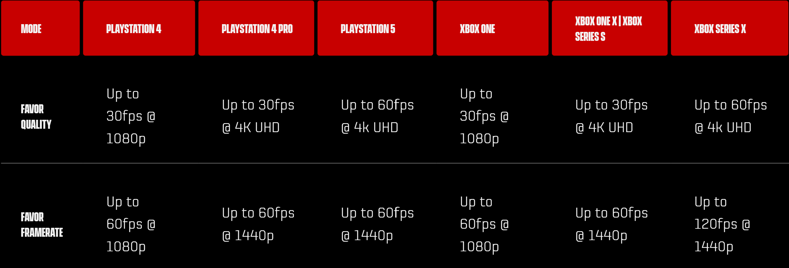 سيعمل وضع الجودة على أجهزة PlayStation 4 و Xbox One بدقة 1080P و سرعة إطارات تصل حتى 30 إطار بالثانية، في حين أنه سيعمل على أجهزة Xbox One x – Xbox Series S و PlayStation 4 Pro بدقة 4K و سرعة إطارات تصل حتى 30 إطار بالثانية. و أخيراً سيعمل وضع الجودة على أجهزة PlayStation 5 و Xbox Series X بدقة 4K و سرعة إطارات تصل حتى 60 إطار بالثانية.