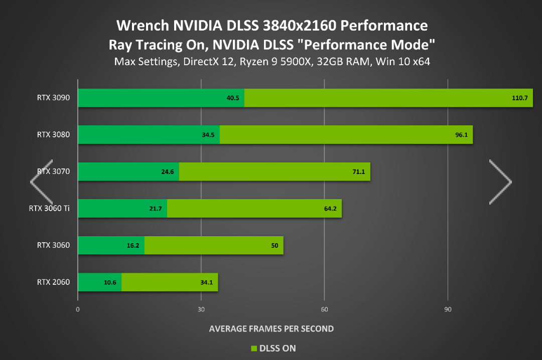 تدعي Nvidia أنه يمكنك مضاعفة الأداء في لعبة No Man’s Sky على إعداد Ultra Graphics عند استخدام DLSS في وضع VR. وفي لعبة Wrench، ستحصل على زيادة تصل الى 80٪ بالنسبة لادائها السابق، بينما يبدو أن لعبة Into The Radius ستصبح تجربة ممتعة أكثر بكثير مع تفعيل DLSS.