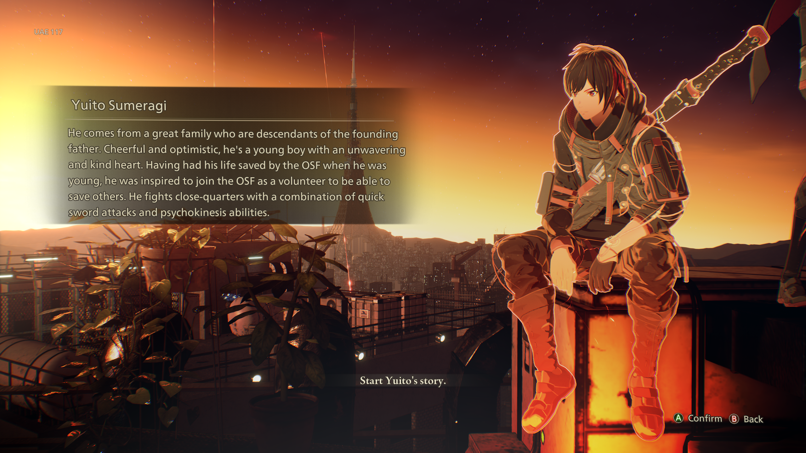 بداية في الديمو تبدأ بإختيار شخصيتك الرئيسية سواء شخصية الفتى Yuito Sumeragi أو شخصية الفتاة Kasane Randall، و كلاهما عملاء لفرقتين منفصلتين في منظمة OSF ( Other Suppression Force ) و كما عرفنا في فيديوهات العرض السابقة للعبة فأن مهمتك كلاعب هو القتال ضد الOthers وحماية الإنسانية و البشرية منهم.