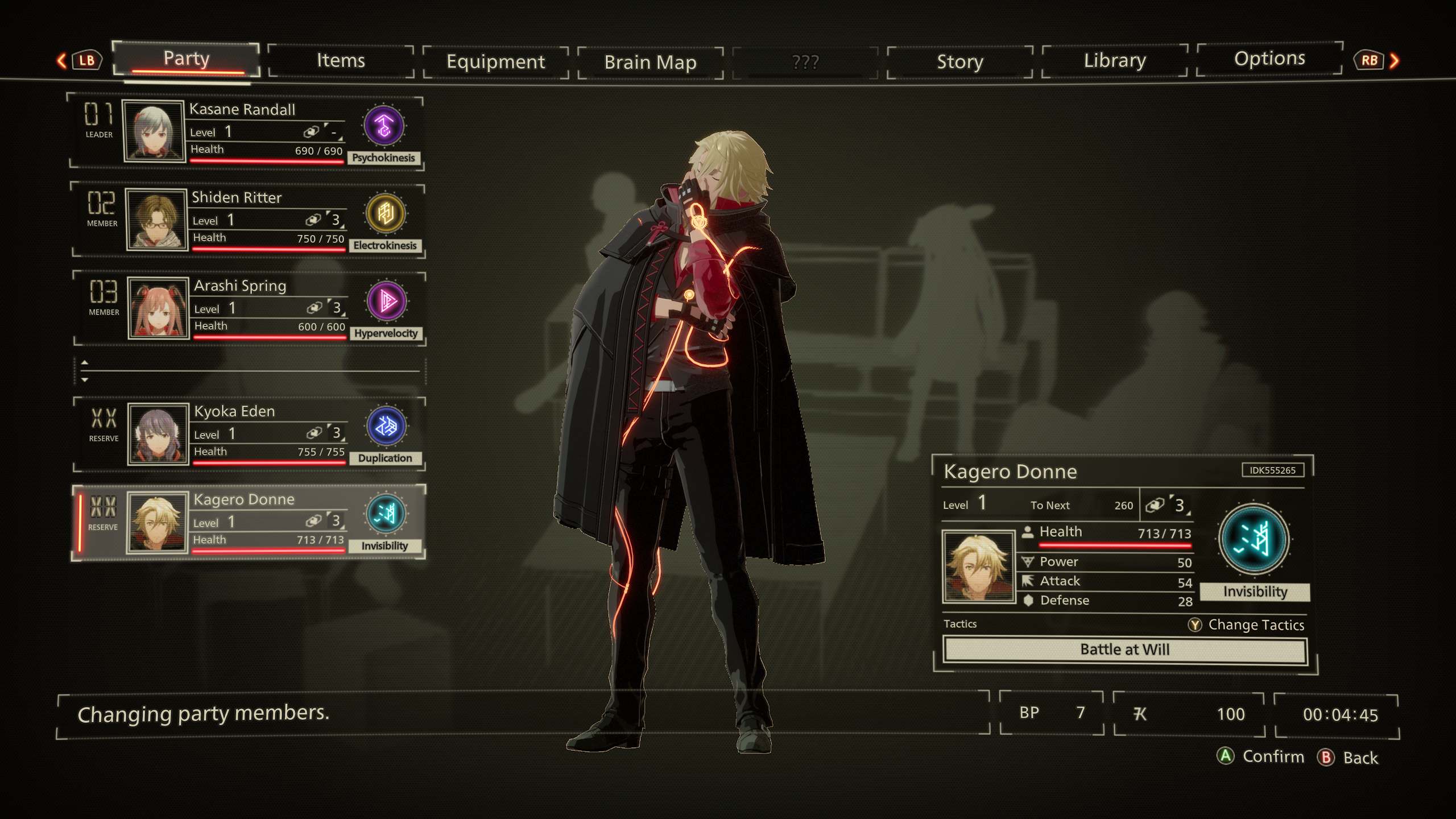 لكل شخص في فرقتك له قدراته الخاصة به فمنهم من يتحكم بالنيران و الآخر بالكهرباء و بعضهم لديه القدرة على الإختفاء أو إعطائك درع لكي لا تتأثر بضربات الأعداء و الوحوش، لكن لأبطالنا الرئيسين Kasane و Yuito نفس القدرة و التحكم بالأشياء في البيئة و رميها على الأعداء، و أعجبتني إمكانية أن البطل يستطيع إستعارة قوى زملاء فرقته.