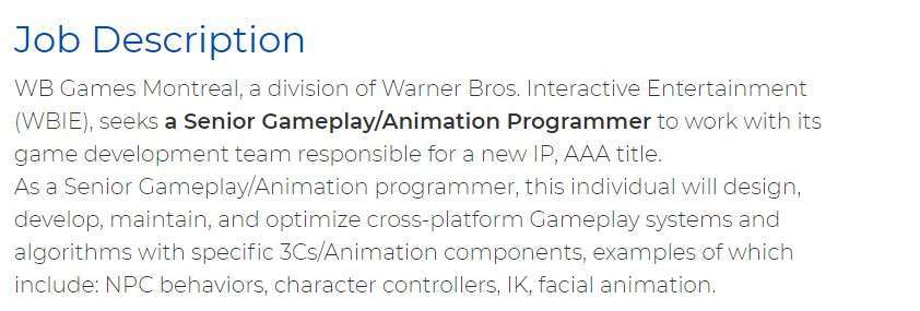 كما ذكرت شبكة الأخبار PCGamesN ان إستيديو Warner Bros في Montreal قام بطرح قائمة وظائف لمبرمج ألعاب رسوم متحركة خبير في الوصف الوظيفي، و تم الإشارة إلى أن المنصب سيتضمن المسؤولية عن عنوان جديد بتصنيف AAA.